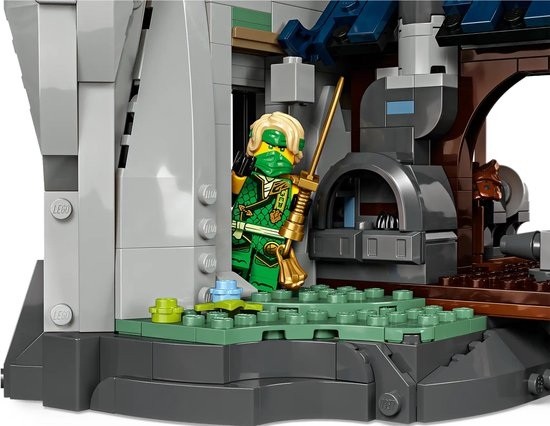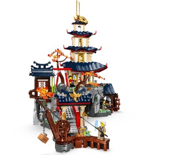 De NINJAGO tempel, die in een rotswand is gebouwd, heeft een pagode met 4 verdiepingen, een brug, een watermolen waaraan kinderen kunnen draaien om 2 strijdplatformen te verplaat sen en een smeedhamer, plus vallende stenen die worden geactiveerd door op een lantaarn te drukken, een verborgen opbergruimte en een geheime deur. De open achterkant van de tempel biedt extra speelmogelijkheden om leuke verhalen te bedenken.