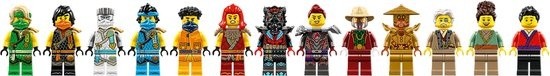 • 13 NINJAGO® minifiguren – dit ninjaspeelgoed is inclusief Lloyd, Cole, Nya, Zane, Arin, Wyldfyre, Lord Ras, Jordana, meneer Bleek,een smid, een tempelbewaker, Roby en Bleckt voor rollenspellen